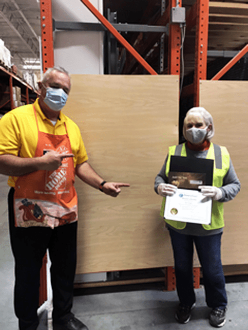 Mary Sexton recently received a Bravo Award for outstanding performance at Home Depot. Mary is pictured here with Store Manager John Wishmeyer. Congratulations, Mary! Keep up the great work!